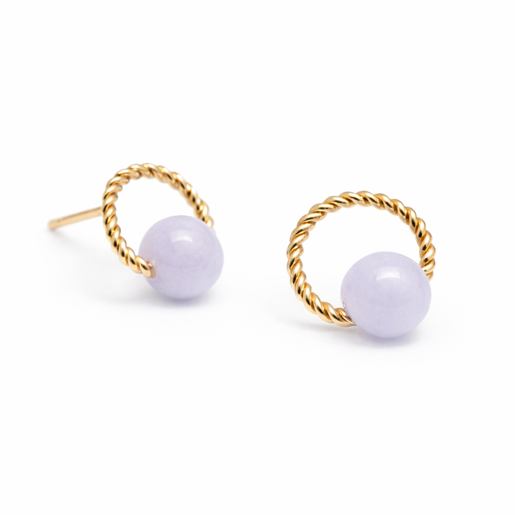 These earrings feature a soft lavender jade bead framed by a twisted gold halo. The gentle pastel tone adds a subtle touch of colour, making them perfect for everyday wear.